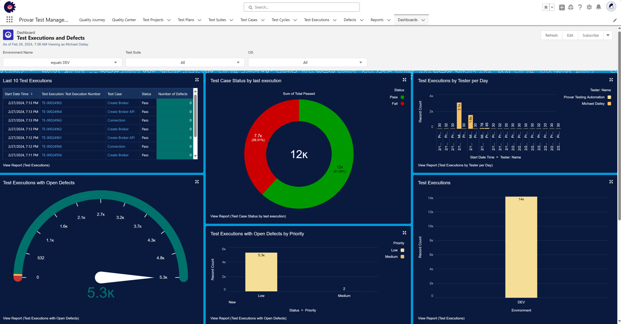 テスト結果、カバレッジ、欠陥傾向、環境別リスクを統合ダッシュボードで表示します。QA、開発、管理部門、ビジネス部門が共通の品質指標でリリース可否を判断可能です。
